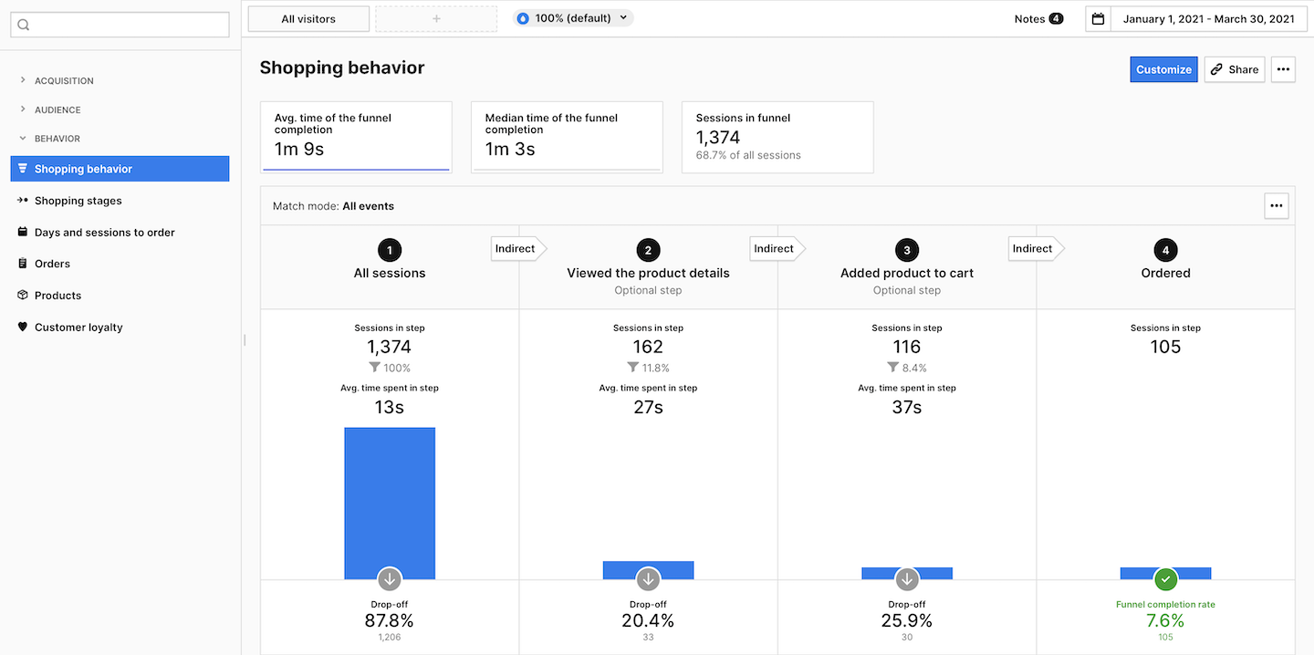 For example, you can learn if visitors revisit the same product pages and then proceed directly to the shipping information. This knowledge allows you to improve the content of your product page by providing a link to the shipping information on the product page, reducing the time from consideration to purchase.