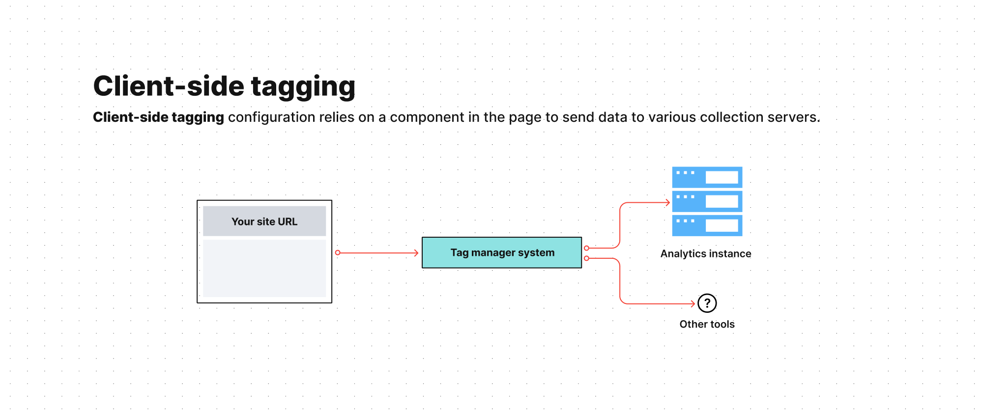 A typical client-side tagging configuration relies on trackers installed directly on the page and sending data to various collection servers, such as your analytics, A/B testing tool, or CRM.