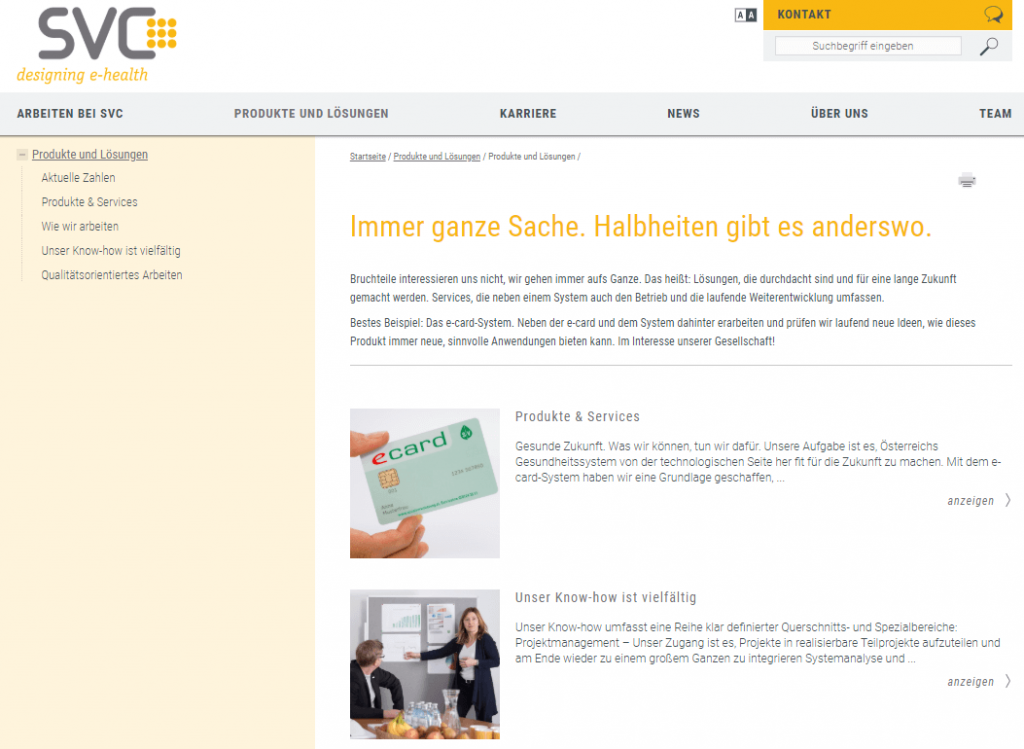 As a full-service provider, it is responsible for the internet portal of Austrian social insurance carriers and their sub-pages, such as urgent care centers. SVC provides the entire technical infrastructure for this product, from hosting and datacenters to technical specifications and the development of new applications and services.