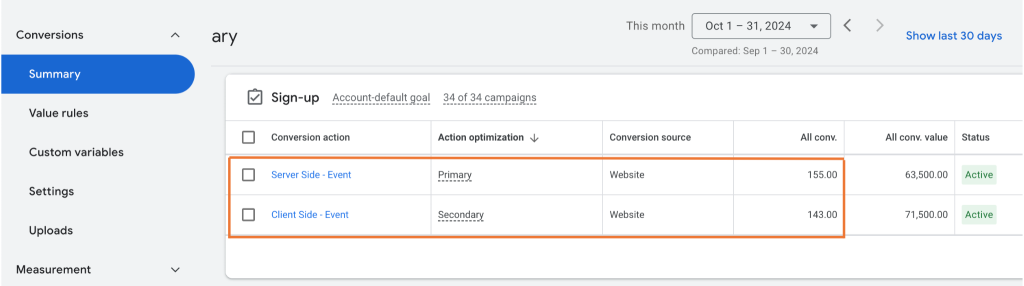 In the Google Ads dashboard, when you go to your conversions, you can see a difference in the number of conversions measured between client-side and server-side tracking.