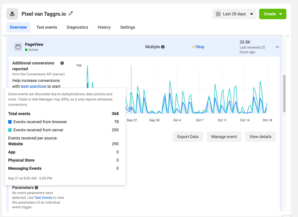 When you log in to Facebook Business Manager and navigate to your conversions, you’ll notice a difference between browser-based and server-based measurements if sGTM is set up. The green line represents server events, while the blue line represents browser events. In this example, server-side tracking captures 22% more data.