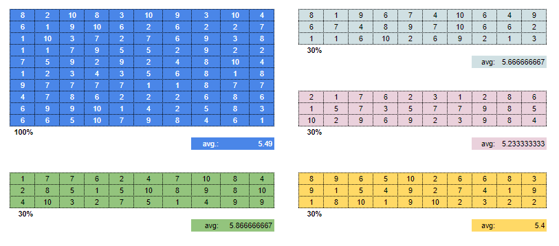 As you can see in figure A, we chose 100 numbers between 1 and 10. Then, we calculated the average. If we include the entire data set, we get an average of 5.49. But if we take a sample of 30%, we see a fluctuating error rate. Four randomly drawn samples provide different results ranging from 5.23 to 5.87. If the break-even point for a channel is 5.5, then you’ll make a different decision based on which random sample you use. Your decision will be random, in effect.