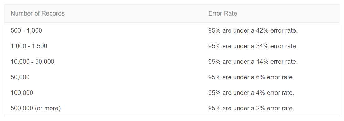 The reliability of results from sampled data depends heavily on the selection of the sample itself. In addition, the size of the extracted data set proves to be a decisive factor in determining the error rate. As you can see in this table provided by Adobe: