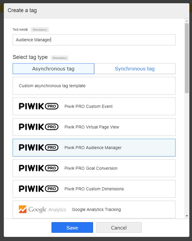 Configuration of this type of tag is simple. Choose the right template in Piwik PRO and set the name. We’ll call it Audience Manager (you can chose a different name, but keep in mind – it’s a good practice to choose clear and easy-to-identify names so you’ll be able to recognize them later).