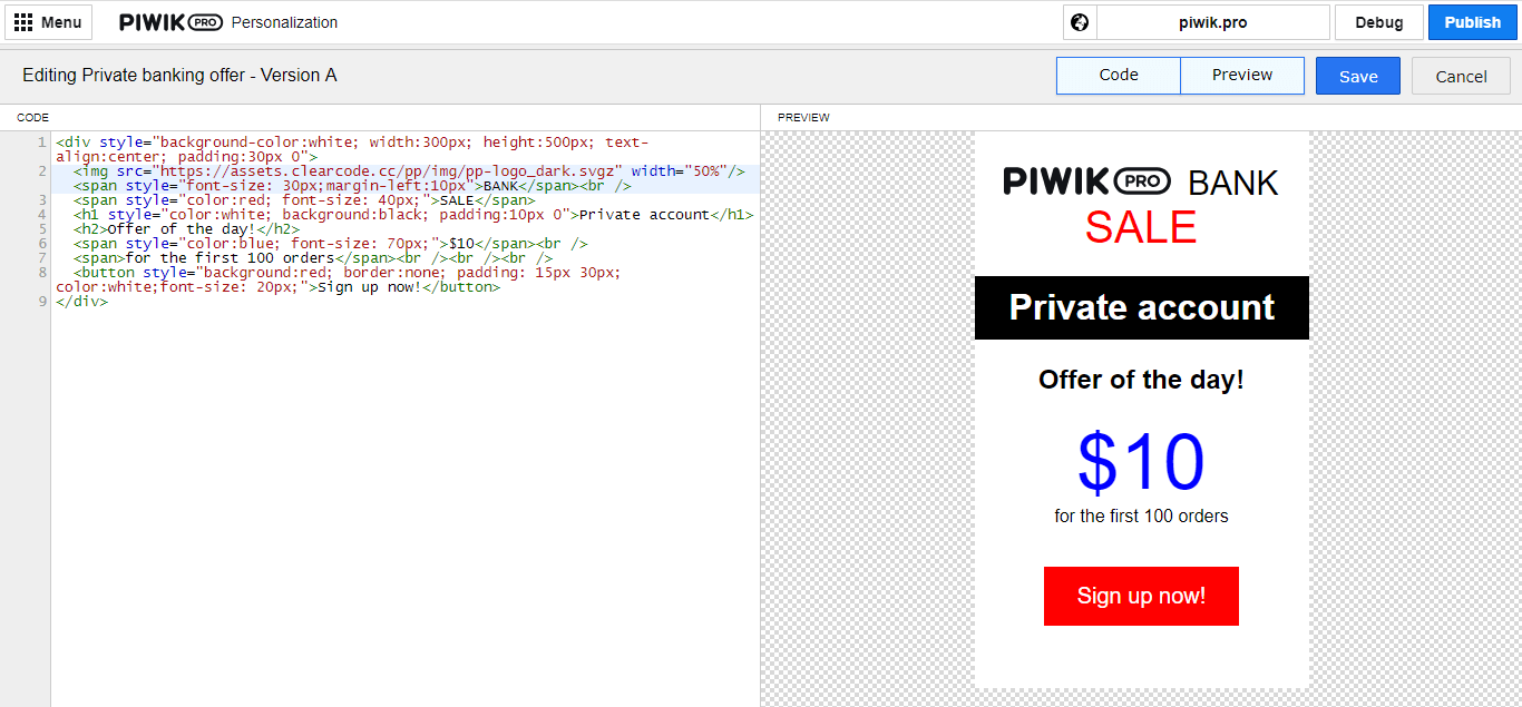 We’ll take you on a journey through the features of Piwik PRO Analytics Suite by exploring how to counter a shrinking base of banking customers with personalized banners and pop-ups. Personalization of your websites is also a great way to improve the acquisition and retention of clients, and improve cross- and upselling campaigns, but we’ll focus on the content personalization itself. You’ll see how to prepare a special offer and display personalized content on your website to a group of people you want to reach to drive more conversions and to boost your marketing efforts.