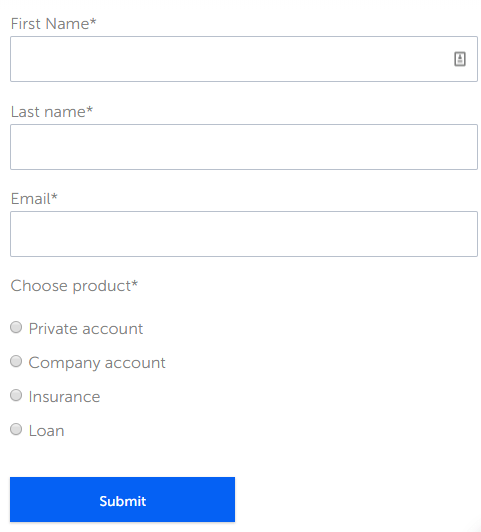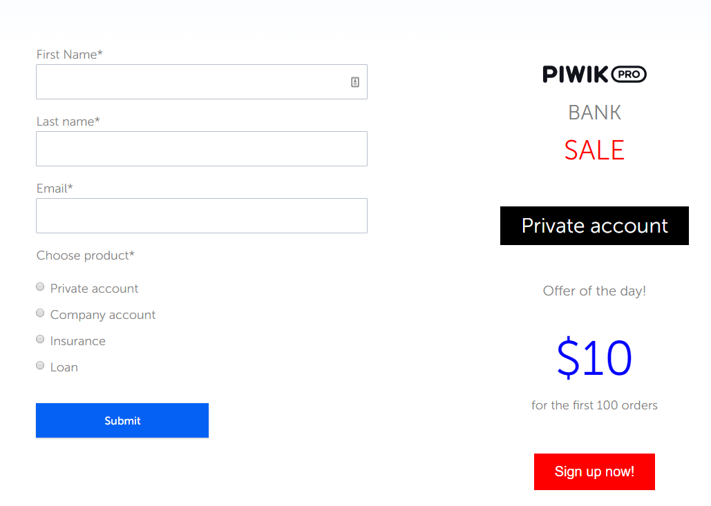 We want to display personalized content for people who filled and submitted a form, and chose the Private account option in the Choose product part of the form. The form would look something like this: