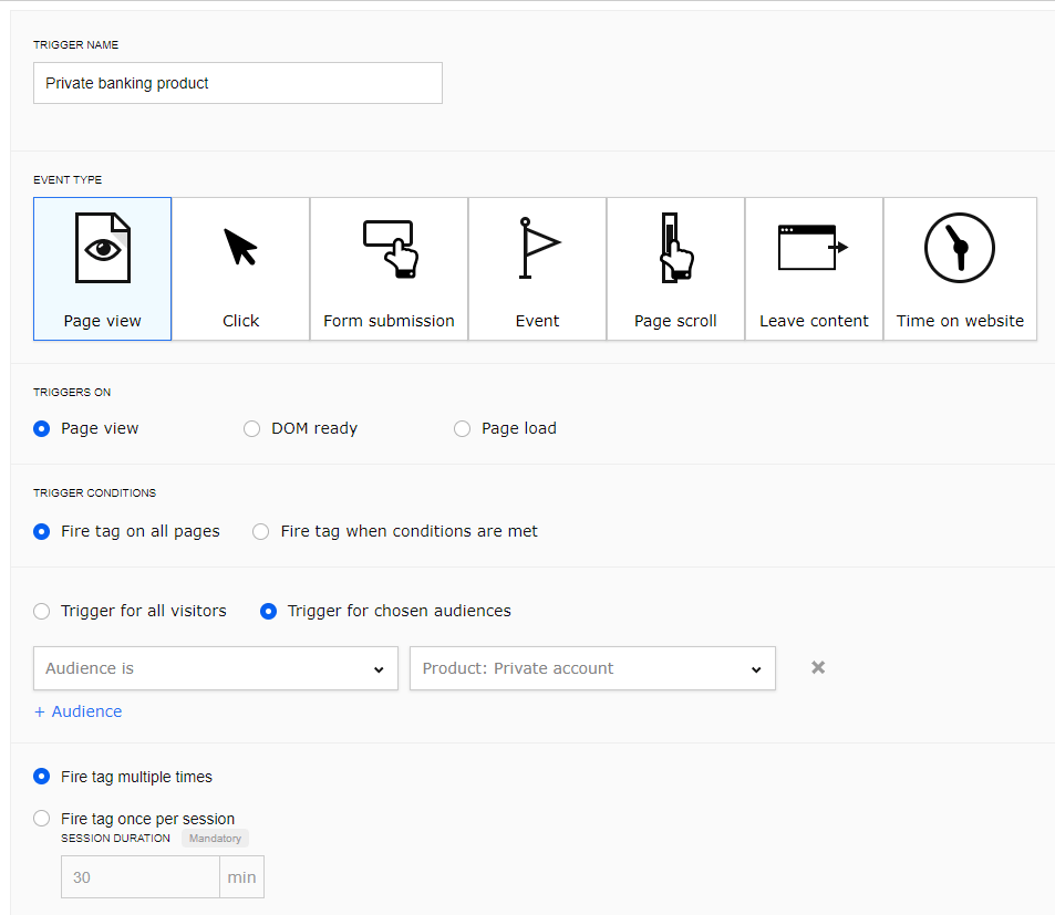 We have chosen the Page view tag type to display this banner every time a user reaches the place we designated in the website code. That’s why we have also chosen the Fire tag multiple times option. The only limitation on this trigger is our predefined audience – just like we planned.