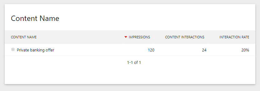 So after waiting a few days (or weeks – it’s up to you to set the timetable for your personalization test) we can check out Piwik PRO Analytics and go to Actions > Contents report. Here we can check all the impressions and user interactions (calculated into the interaction rate) for our configured piece of personalized content: