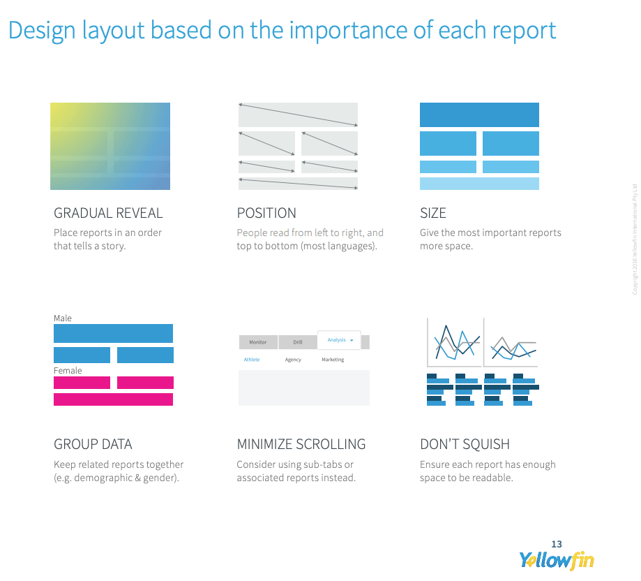 Your critical insights and the most important data should be presented before anything else. Each section of your dashboard should read from the top (most important) to the bottom (least important). People using your dashboards will appreciate the ability to quickly get the information they need to make strategic decisions.
