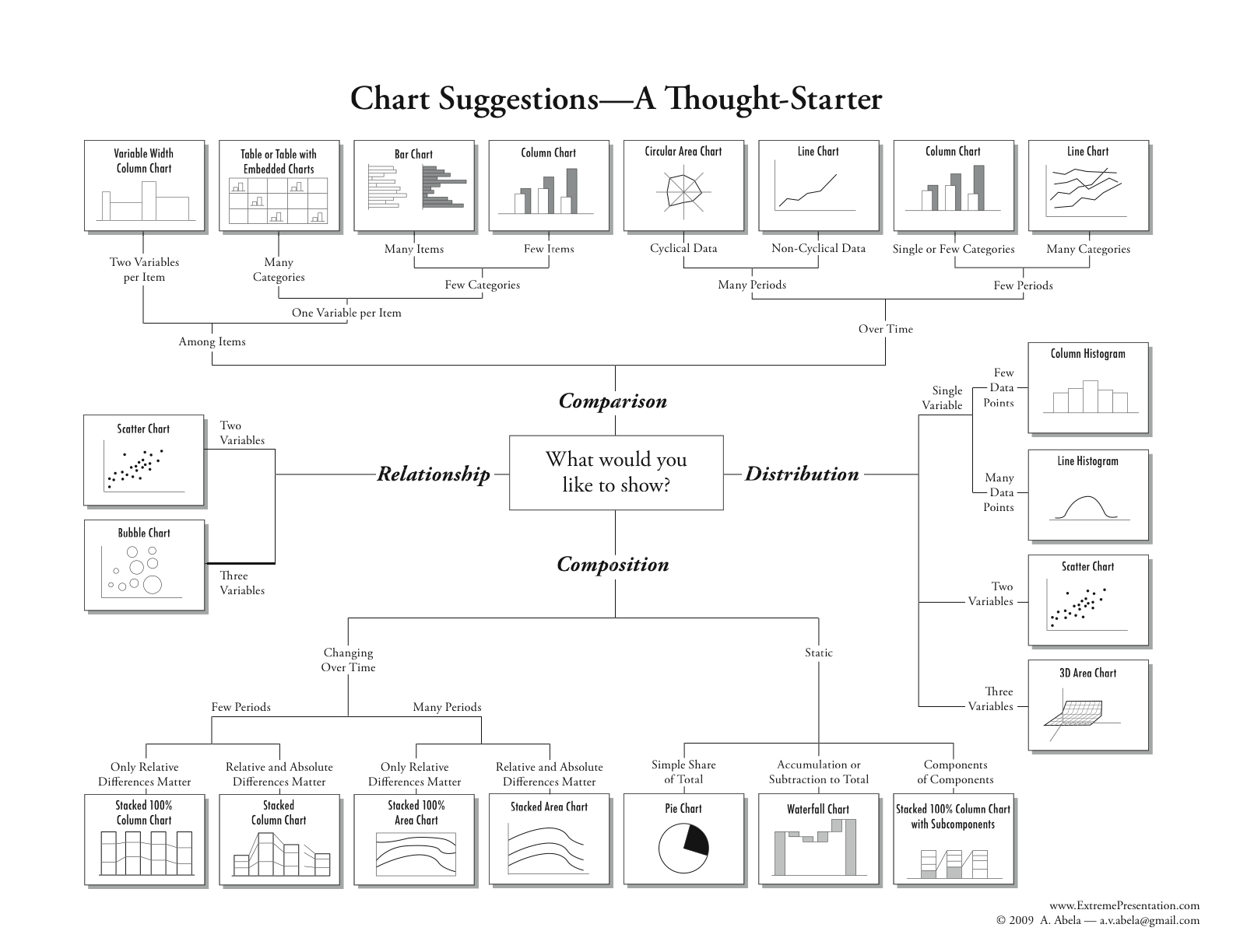 For example, when using a line chart to display value over time, the unbroken line gives a sense of continuity that a bar chart doesn’t have. Keep experimenting to reach the goal of easily communicating a predetermined story. Below is a kind of “cheat sheet” you can use as a starting point.