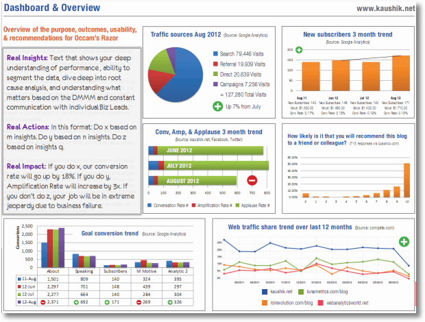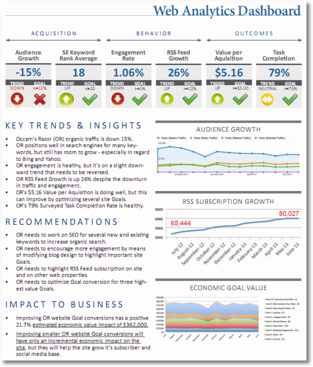 - Tactical: This is where you start blending the written word with metrics. You’ll provide segmented data, written insights, recommended actions and business impact. Use historical data and compare it against established goals. Your data compliments your insights and shows your recommendations are backed by data.