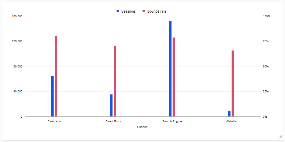Here’s an example of a bar chart showing the bounce rate and number of sessions by traffic type: