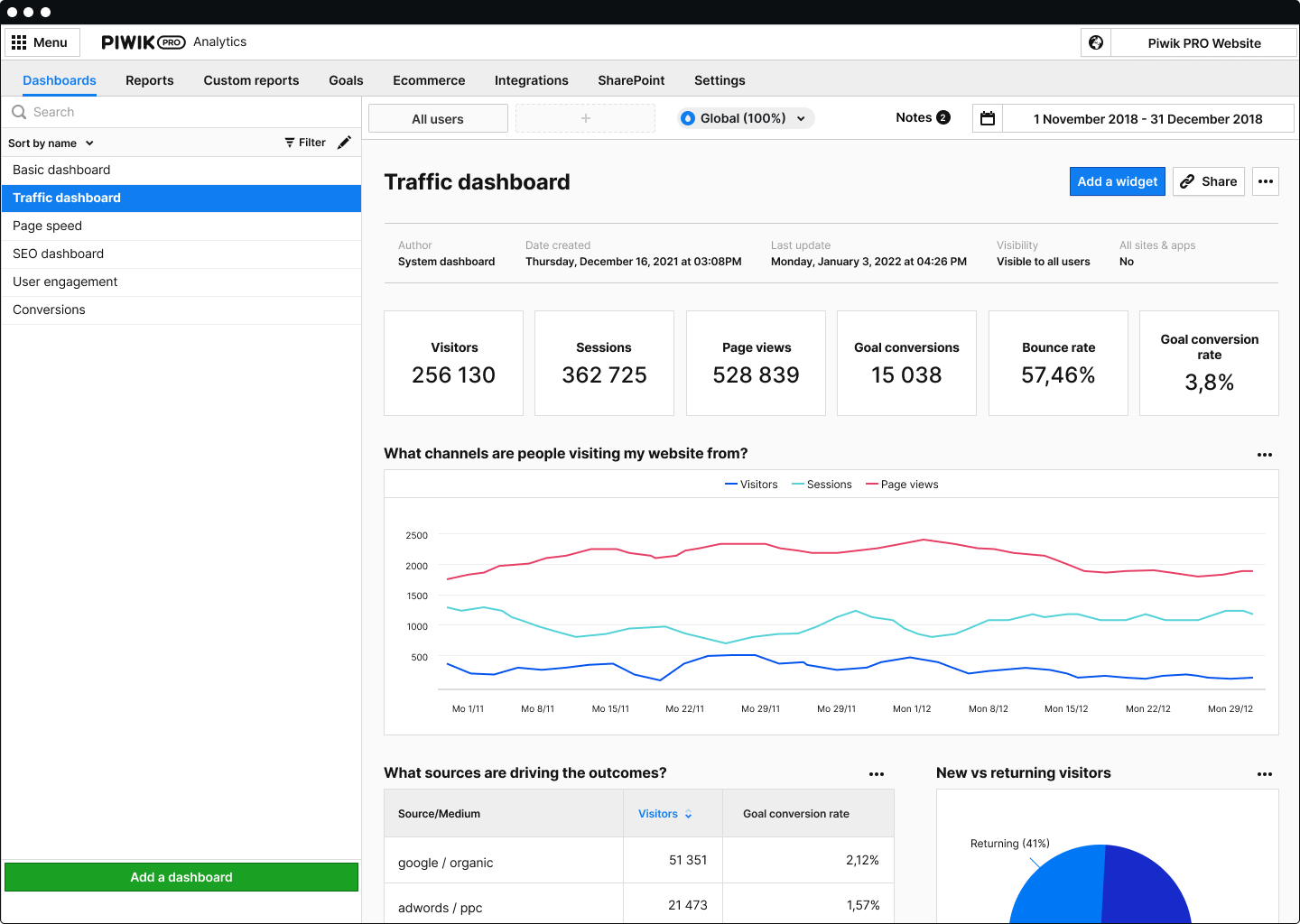 Piwik PRO provides a user-friendly interface with customizable dashboards and reports. It offers various standard and advanced reports and visualizations for analyzing website data. You will find audience reports, traffic acquisition reports, behavior reports to analyze top pages, and conversion-focused reports.