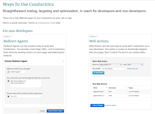 - A/B testing: simple A/B tests let you put two pages head-to-head to experiment with simple changes.