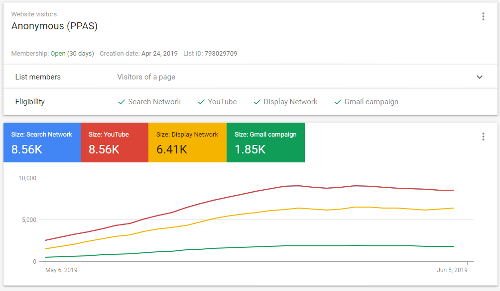 In the example below, we’ve taken our “Anonymous” audience and uploaded it to Google Ads. You can see the networks in which Google found users from this audience.