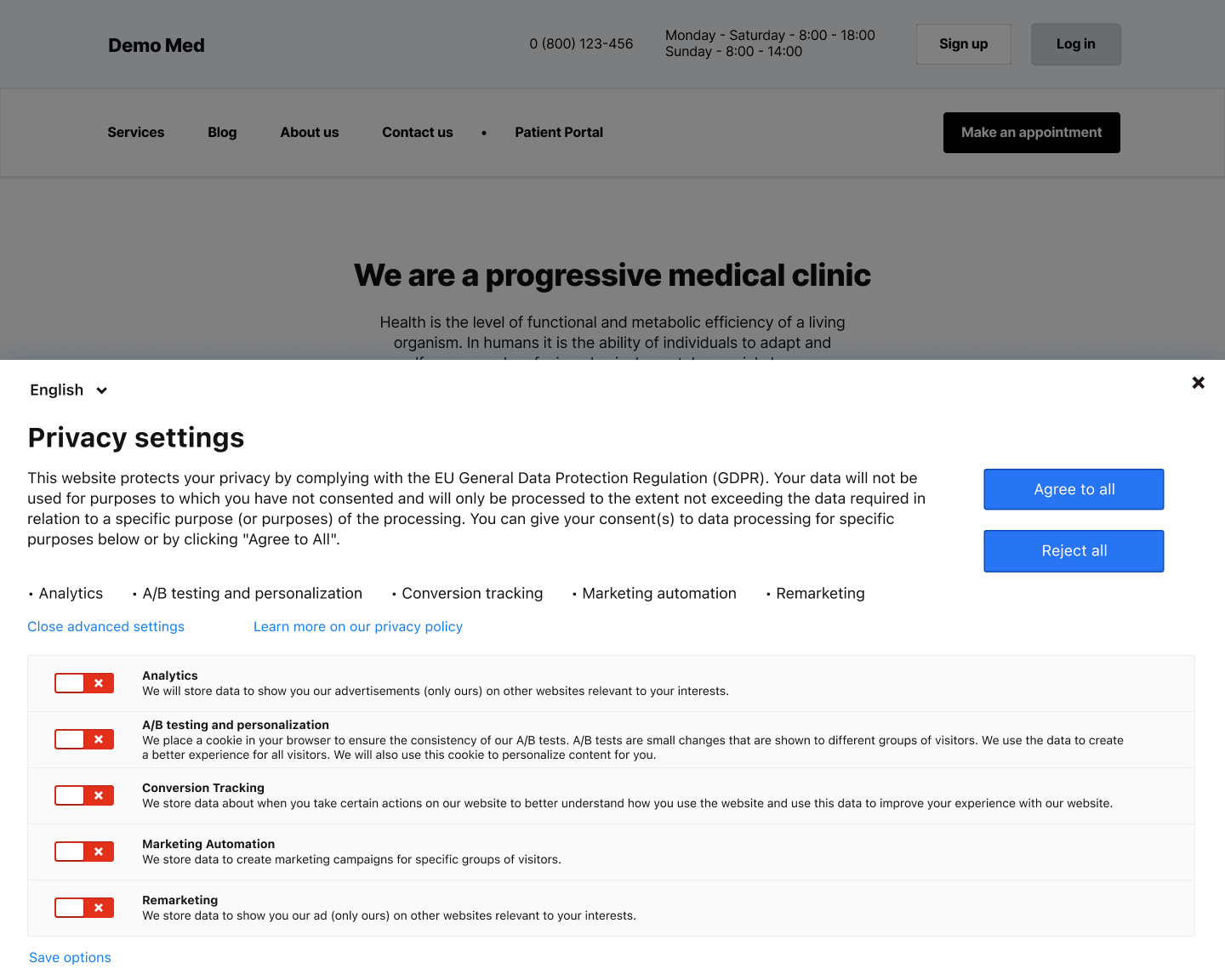 This cookie consent banner is composed of two parts. The first part allows visitors to choose whether to accept or reject all cookies immediately. The second part contains ‘Advanced settings’ that let visitors agree on selected cookies and change or revise their decision. This banner meets all the necessary guidelines and allows accepting and rejecting cookies with a single click.