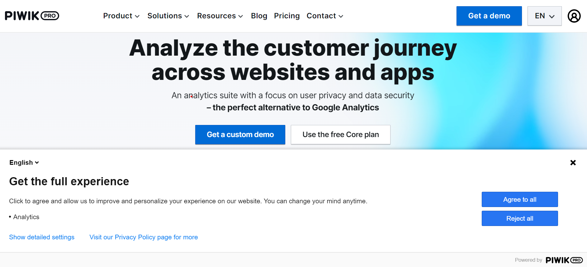 Piwik PRO Analytics Suite offers an integrated consent manager which doesn’t trigger tags unless visitors give their consent. It also allows you to share all consents with the entire marketing stack and work in accordance with data protection regulations.