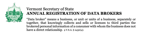 - If you’re a data broker, register with the state of Vermont: Every year, data brokers must register their business on this page and pay a fee of $100. This is the easiest way to protect yourself from trouble in the future if you deal in the sale of brokered personal information in Vermont.