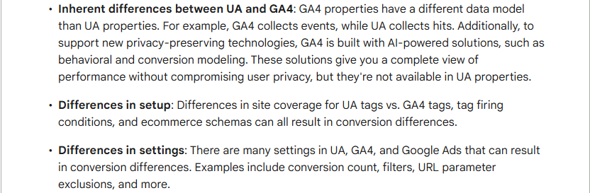 As Google explains, there are three main reasons for conversion differences in GA4 vs UA: