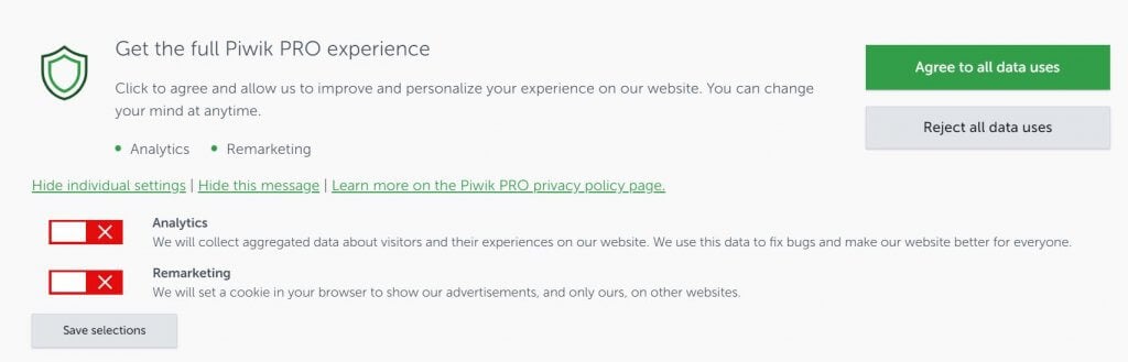 And as we’ve already mentioned, before you start collecting any piece of data, you need to ask your site visitors whether they agree to that or not. It means you don’t load any script, tracker or pixel before gaining users approval. The only exception to that rule concerns cookies that enable your website to load.