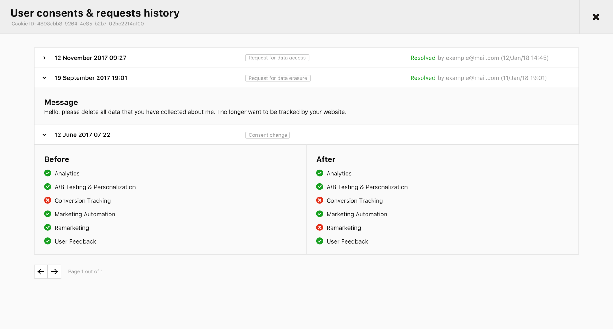 Additionally, admins will monitor all submitted requests, view individual visitor consent status and data subject request history from one place – all from a clear and highly informative panel.