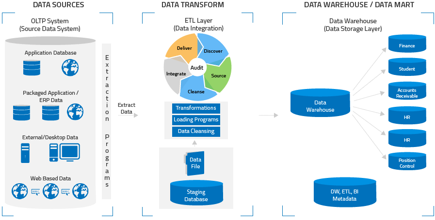 - Although one of the key tasks of a DW is to simplify your data, it turns out that a lot of the work on your side requires a hands-on approach. First, ETL process implementation has to be conducted. That entails retrieving data from data sources, performing all the transformations needed to match the data warehouse schema and requirements, then importing the data into the DW. Second, maintenance is done manually, especially considering that other systems’ APIs and data schemes evolve over the time. This means you may need to monitor and adjust the process of importing to your data warehouse, or you might even notice at some point that the import is broken.