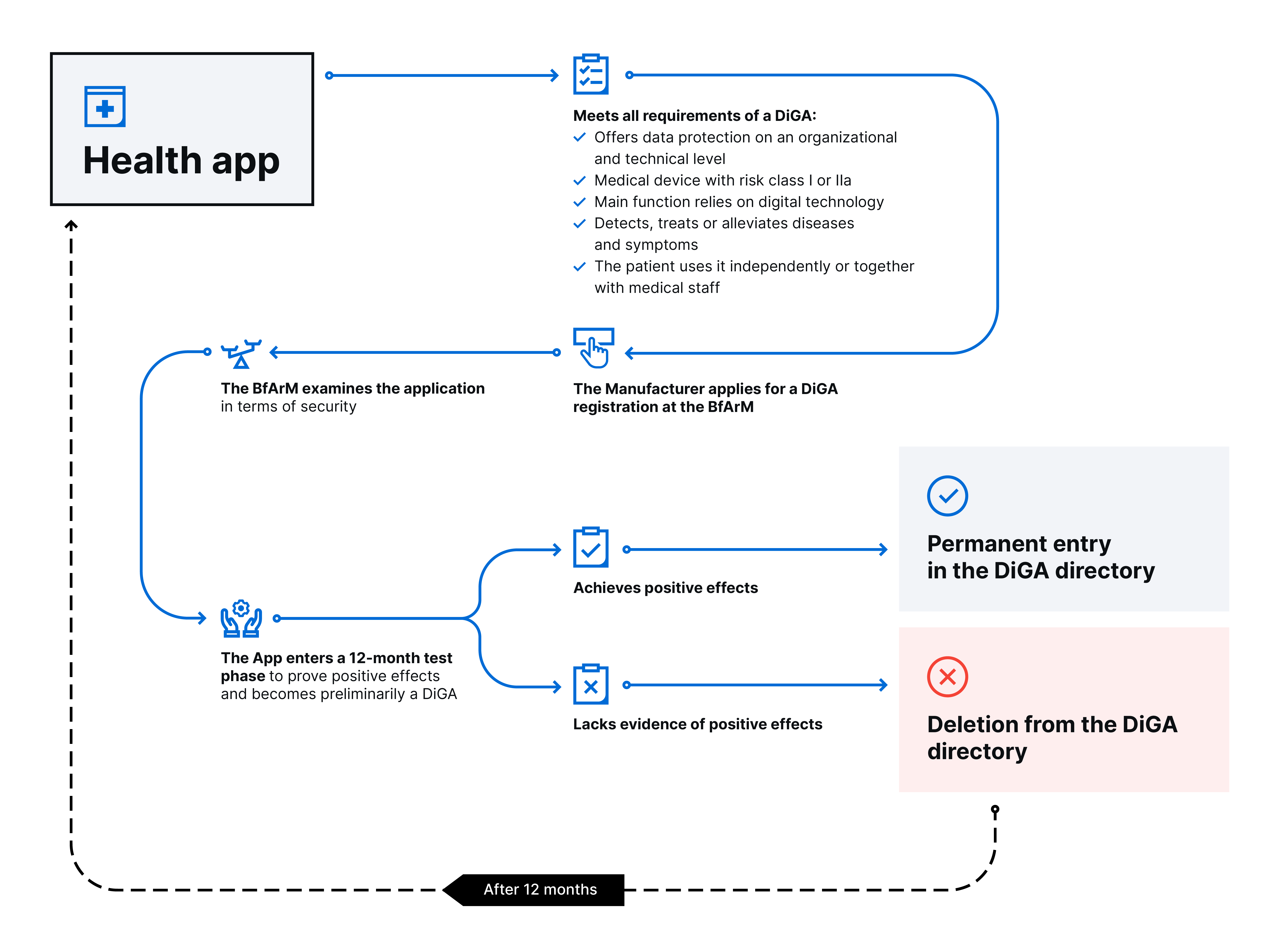 If the effects on a patient’s health are positive, the BfArM registers the app as a DiGA for good. In the opposite case, you may reapply after one year.