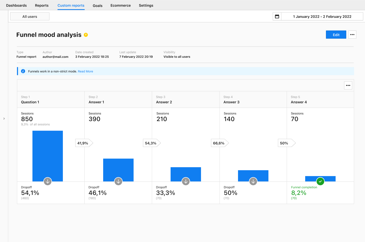 Funnel reports let you review a specific path, especially when you have made changes to your app. Let’s say you have improved the forms for people with disabilities. The funnel allows you to view the path step by step. This includes optional steps as well.