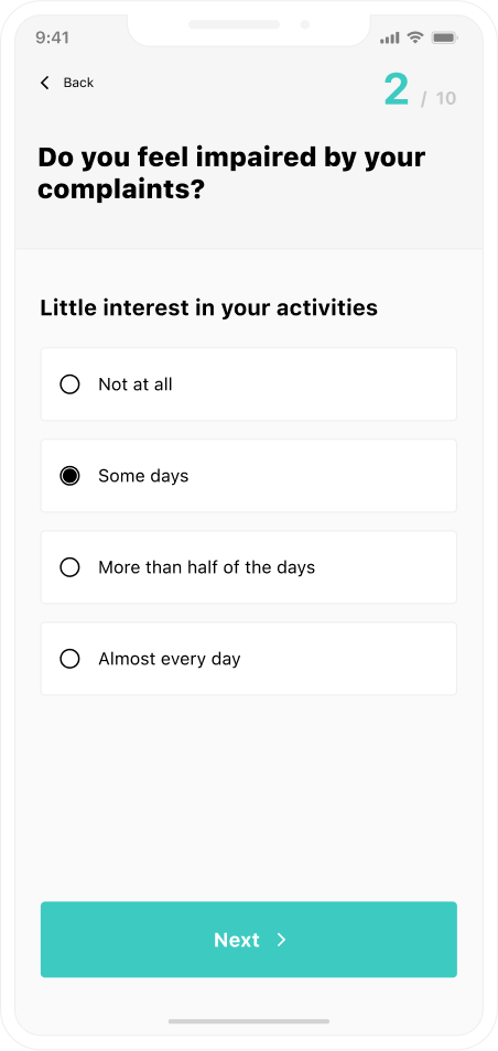 | Description | The app is a digital platform for communication. The patient coordinates and conducts conversations with a psychotherapist via video or phone. | The app offers patients with mild depressive episodes a digital care model. It gives information about the illness, and records and documents moods and symptoms. It lets patients create their own diaries and offers relaxation exercises. If necessary, it automatically notifies the therapist. |