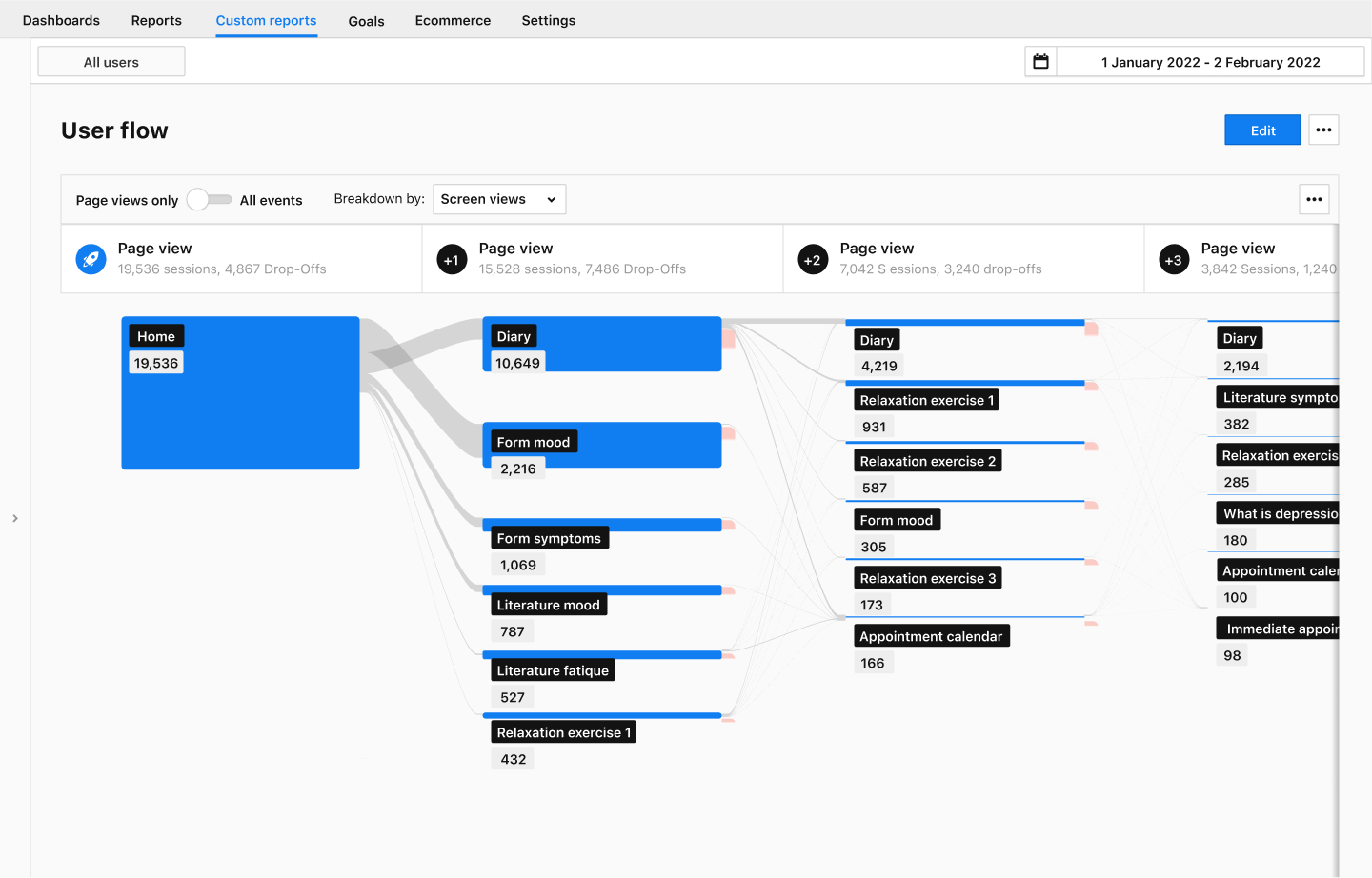 The user flow report shows the paths your users take and whether they encounter any problems. It helps you to spot large drop-offs. Design your DiGA in an easy and intuitive fashion. Compare your planned paths with those of your users. This way you identify gaps in user experience and identify opportunities for further development.