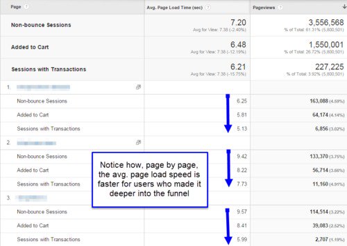 He compared the page load speeds of users who made it through different stages of the conversion funnel. What you get from this report is that page load is faster for customers who mange to go deeper through the funnel.