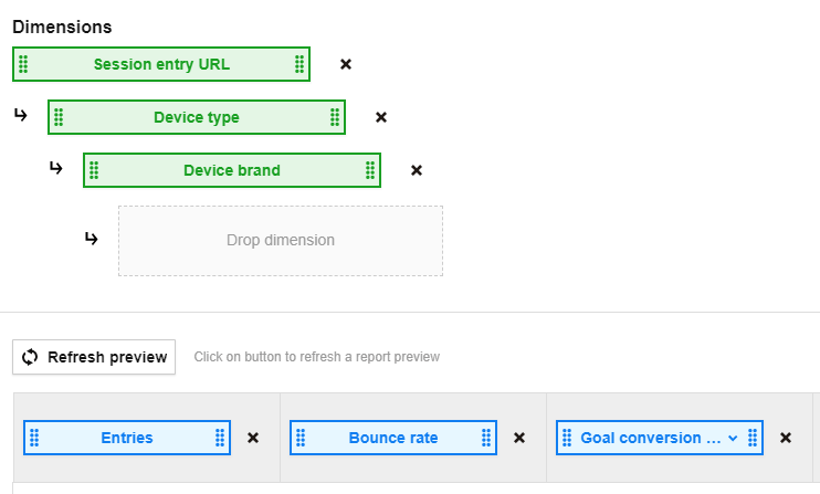 As to the first steps of the set up, select the required dimensions from the list then drag & drop them on the placeholder. Choose: