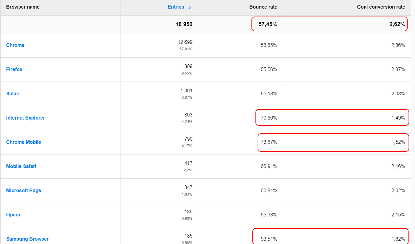 And here you can see right away that Samsung Browser has the highest bounce rate, at 93.51%, followed by Internet Explorer and Chrome Mobile, while the average rate is 57.45%.