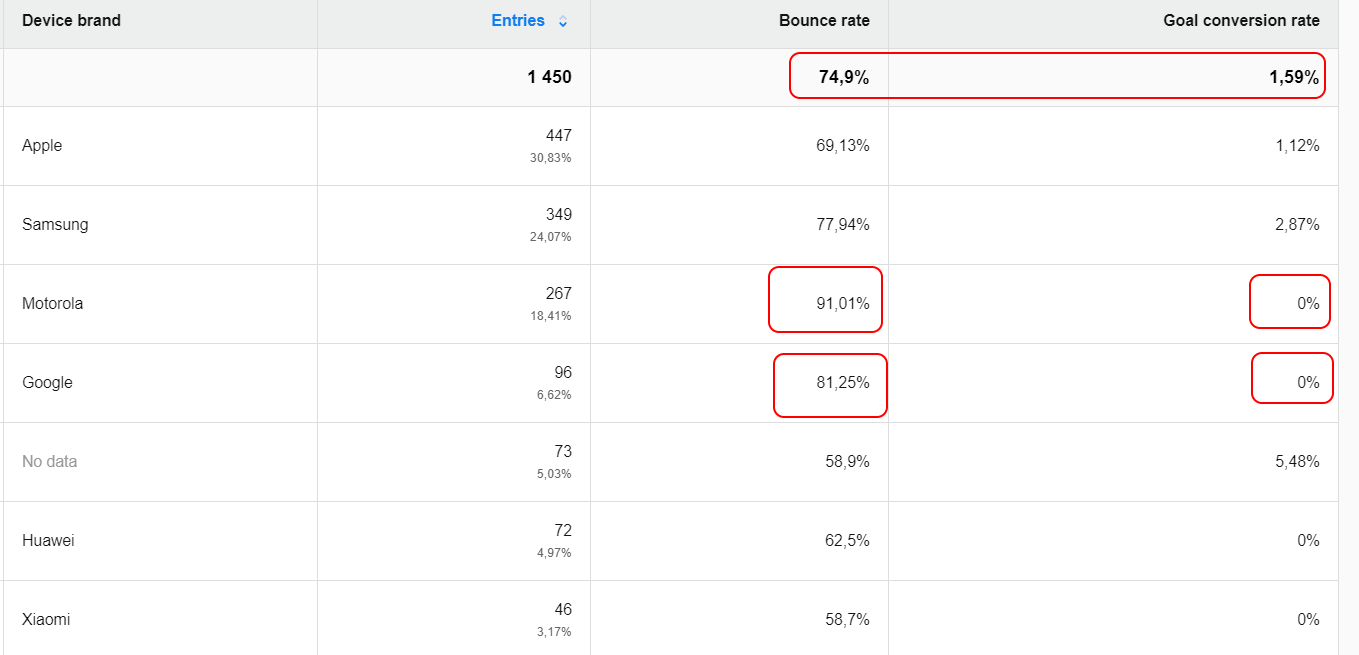 First of all, the majority of users browse the page on Apple devices. Just a glimpse at the report shows us that the dubious honor of first place, with a bounce rate of 91.01%, belongs to Motorola with a 0% conversion rate.