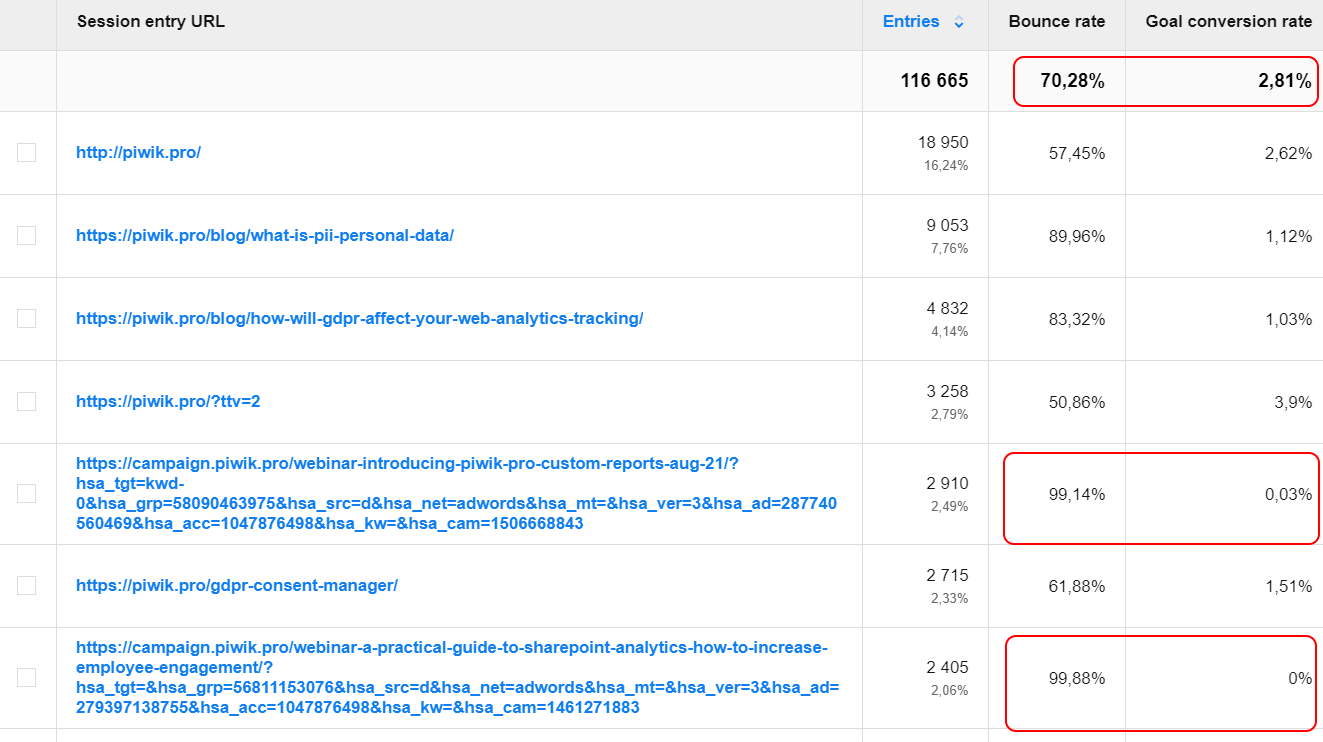 What you should be looking for are landing or entry URLs with extraordinarily high Bounce rate . Namely, rates that exceed the average bounce rate for the whole website and with conversion rates below the average value for the whole website.