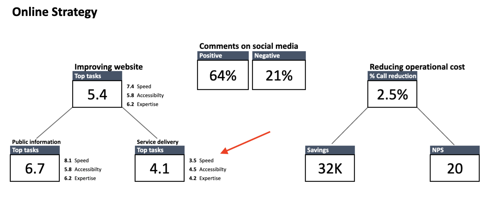 A good rule of thumb is to focus on the areas in which you score the worst. For example, here you can see that the score for service-related tasks is critically low, at 4.1. It means that citizens are facing some major obstacles when trying to access your services.