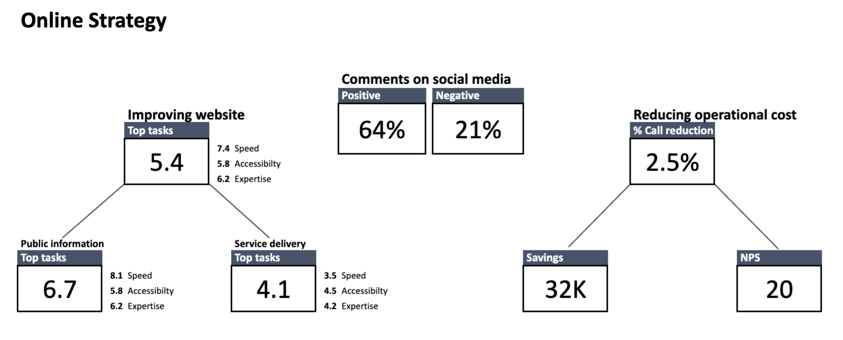 Finally, on the right you see KPIs related to reducing operational costs. It could be, for instance, decreasing operational costs by improving access to information and services through online channels. Additionally, you could also track net promoter score (NPS), which tells you how likely citizens are to recommend a service to friends and family.