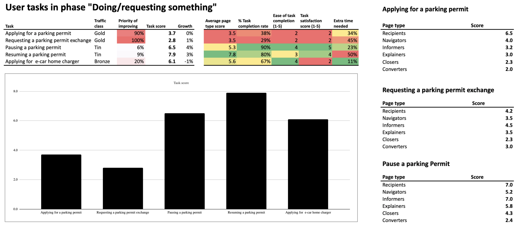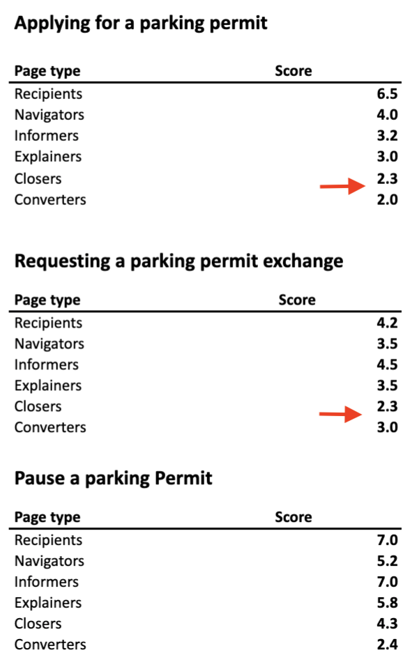 1) Average page type score – Reflects how well different page types are performing in supporting citizens in their task. It’s measured based on the metrics from the right section of the dashboard.