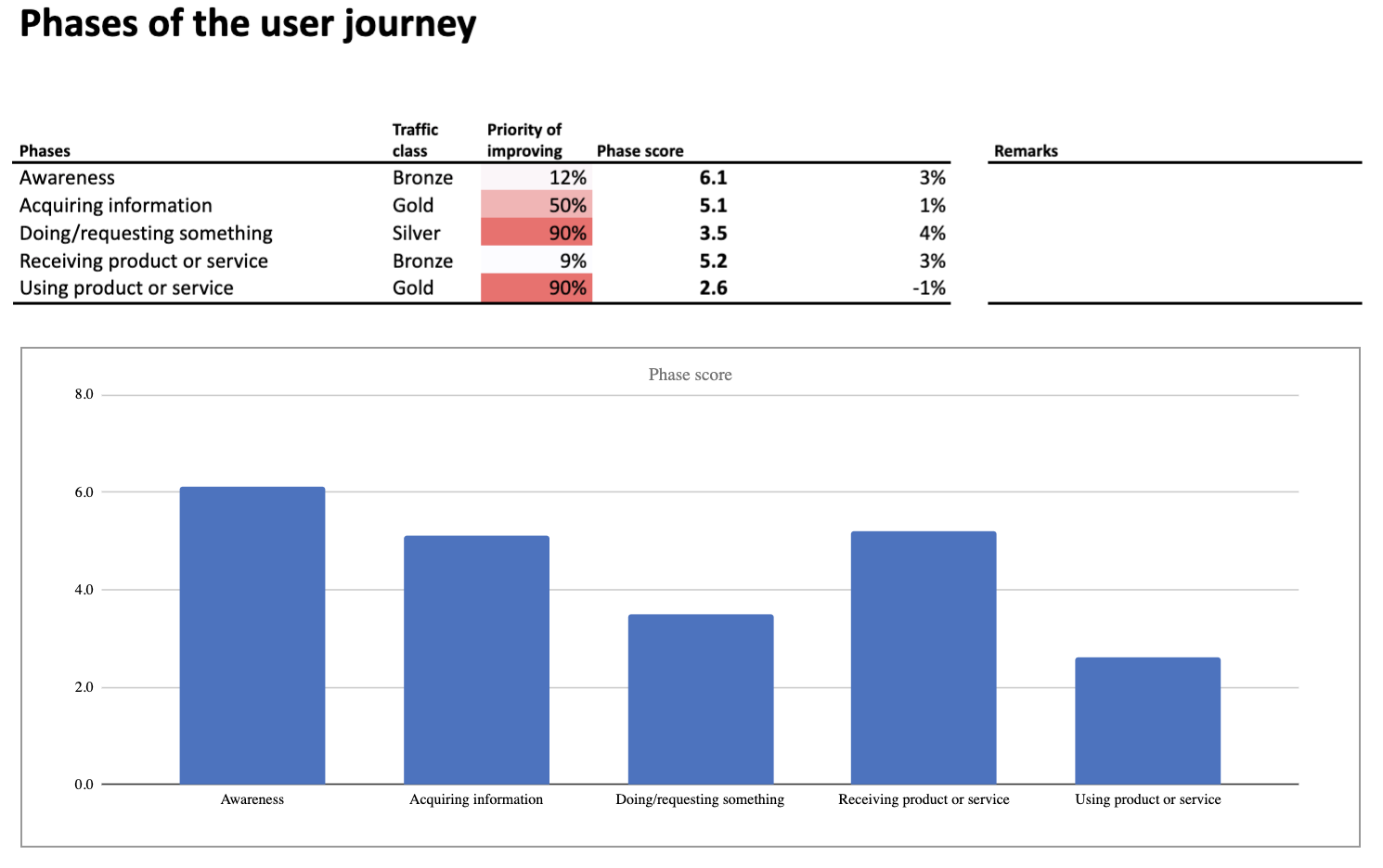 The underperforming phases have the lowest scores and are marked in red, which makes them impossible to miss.