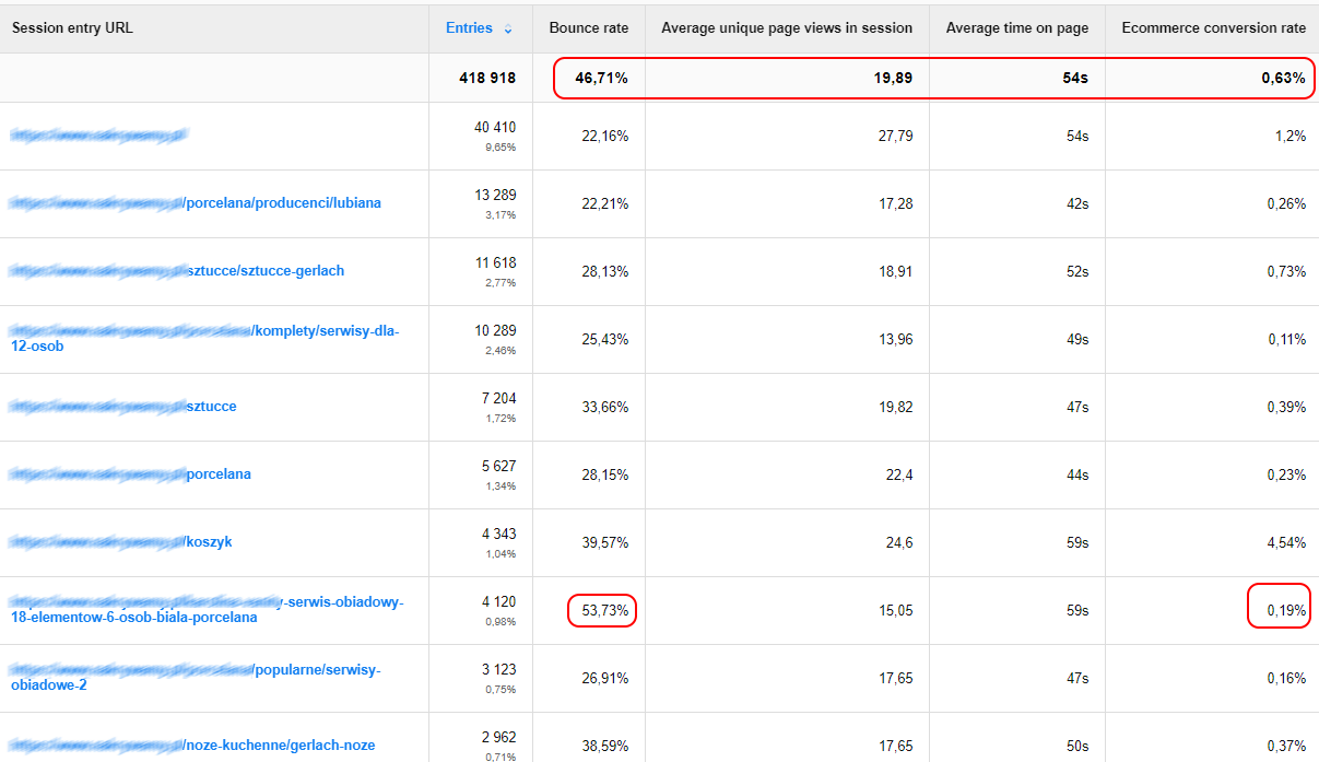 When the setup is done, you can move on to analysis. Look for landings or URLs that have exceptionally high bounce rates. These are pages where the Bounce rate exceed the average bounce rate for the website as a whole, and where conversion rates are below the average value for the entire website.