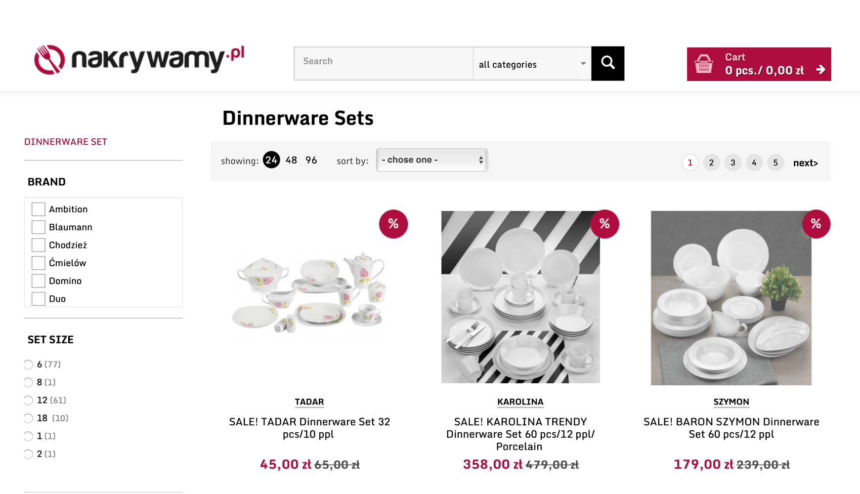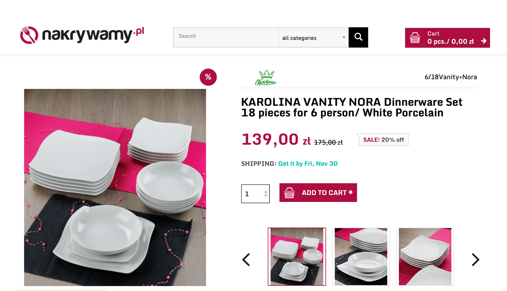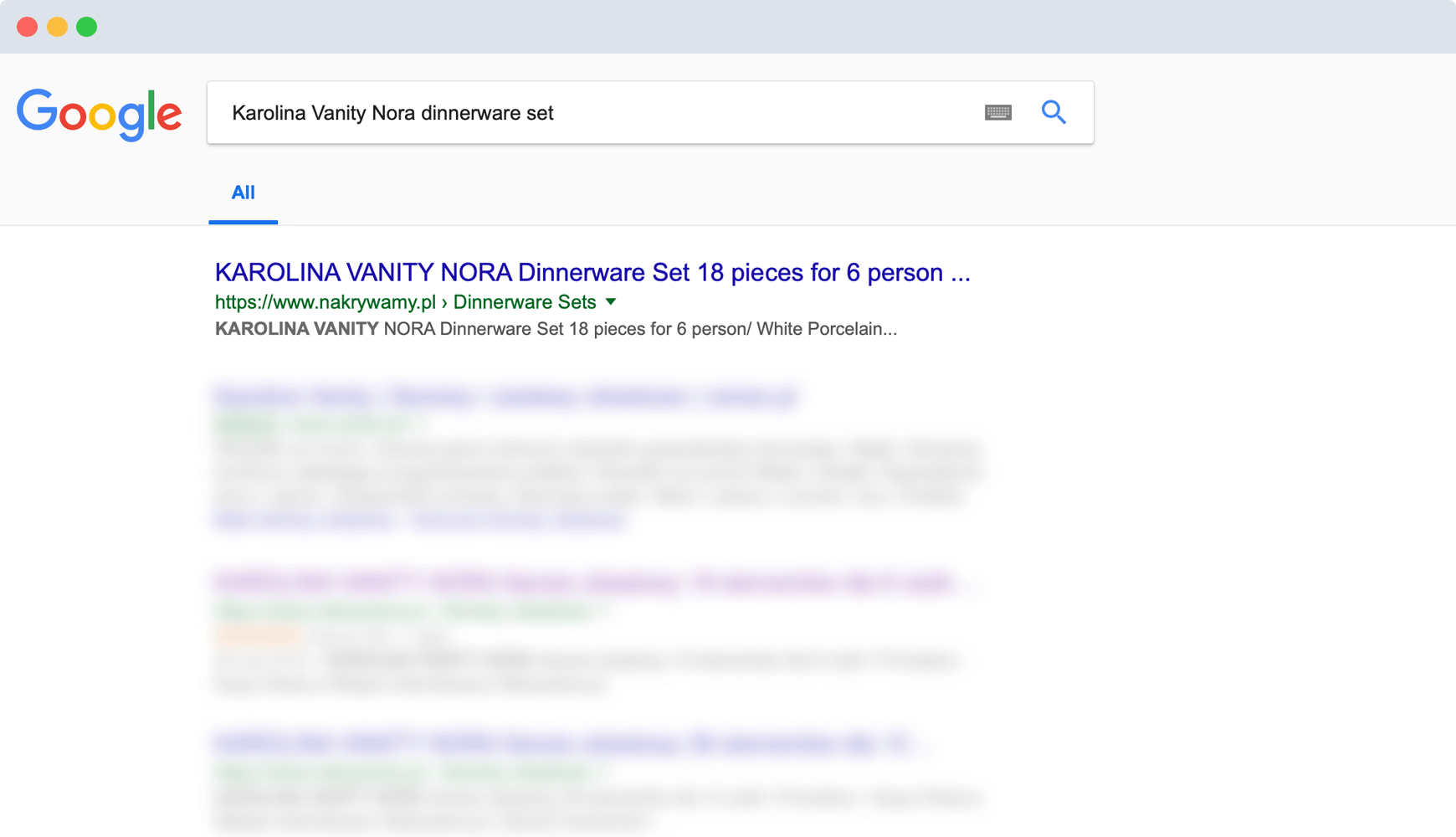 The snippet would make you expect to land on a site with one particular Karolina Vanity dinner set. Unfortunately, the user arrives at a page with multiple different sets, none of which is the one signaled in the snippet.