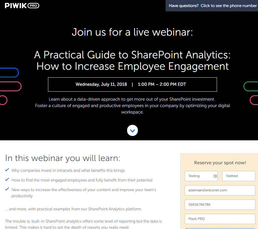 To put it more precisely, the ad promises a webinar on SharePoint and how it can help users lift employee engagement. On the other hand, the landing page headline promotes a practical guide to SharePoint analytics.