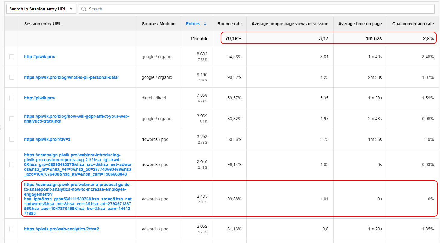 - The bounce rate for this page is also significantly higher than the average value for the whole website. In the given example the average bounce rate is 46% and the bounce rate for the analyzed URL is 53%. That’s an almost 8% difference.