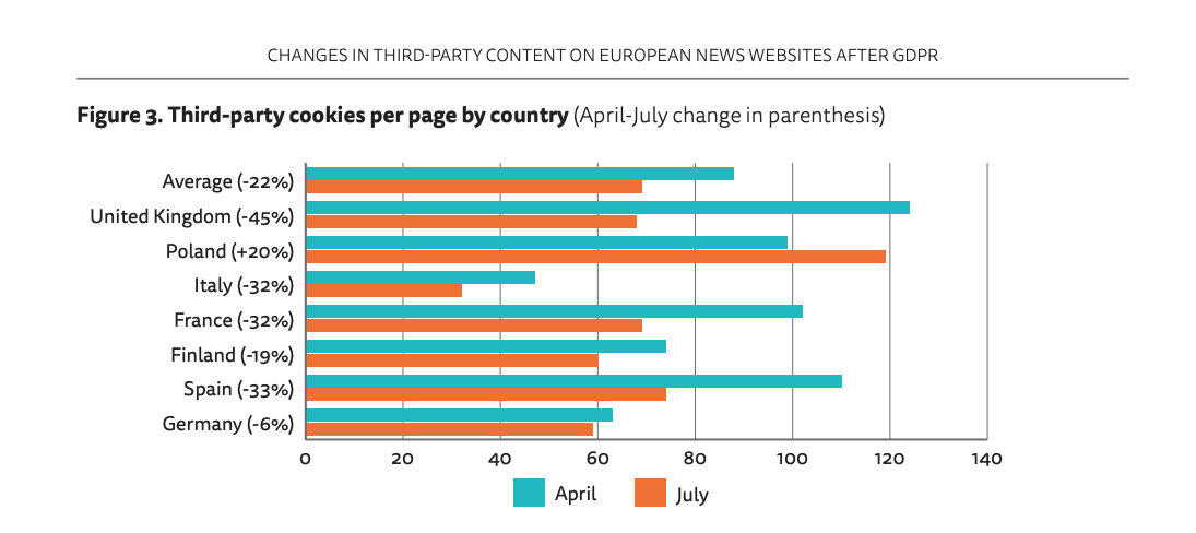 There has been a drop in the use of third-party cookies across the EU, but as this report titled “The State of GDPR Consent” shows, many websites are still not in compliance with GDPR.