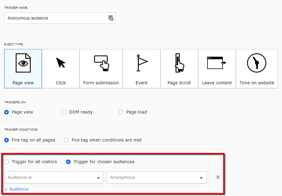 We only want this tag to fire for the “Anonymous” audience, so here’s what the trigger configuration should look like in this case: