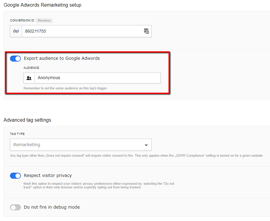 Fill in the Conversion ID and enable “Exporting audience to Google adwords”, selecting “Anonymous”.