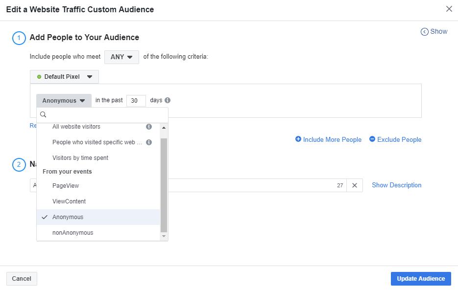 Again, we have to create a new audience in order for our “Anonymous” audience to be available, and Facebook has to receive a request from Piwik PRO Analytics Suite. How long it takes to receive audience specific requests depends on the size of the audience and traffic volume.