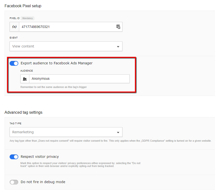 Provide the Pixel ID and choose the audience to export. Again this will be our “Anonymous” audience.