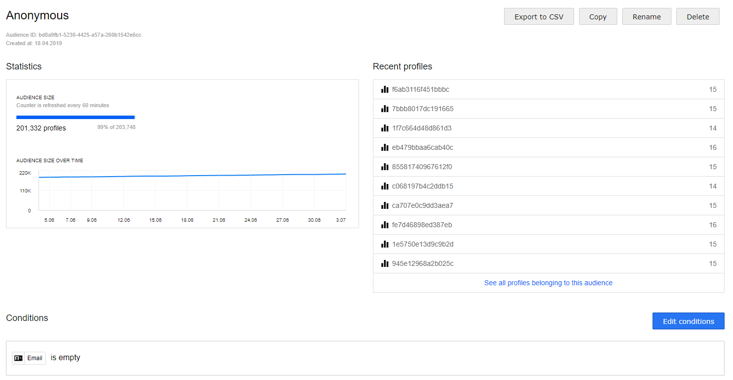 In the Customer Data Platform we need to create an audience for anonymous users. Since they’re most likely first-time visitors, we don’t have any info about them yet.