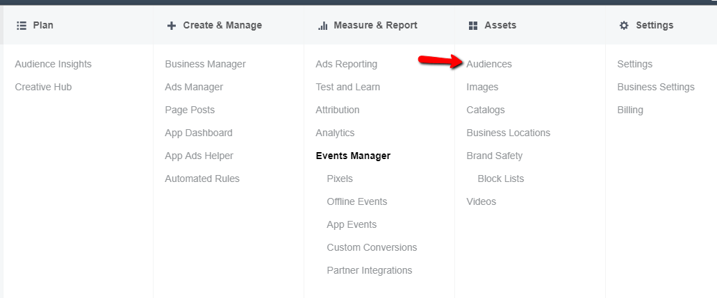 Navigate to the Audiences section in Facebook Ads: